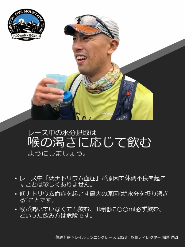 長時間の運動中は「低ナトリウム血症」を起こしやすくなります。レース中の疲労、脱力感、吐き気、頭痛といった体調不良の原因が低ナトリウム血症によることは珍しくありません。