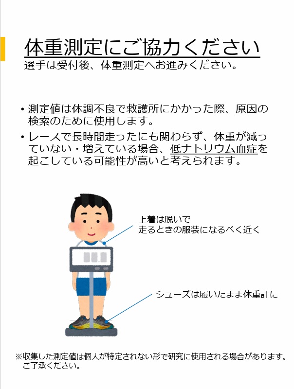 測定値は体調不良で救護所にかかった際、低ナトリウム血症を含めた原因の検索のために使用します。また、個人が特定されない形で研究に使用される場合があります。ご了承ください。