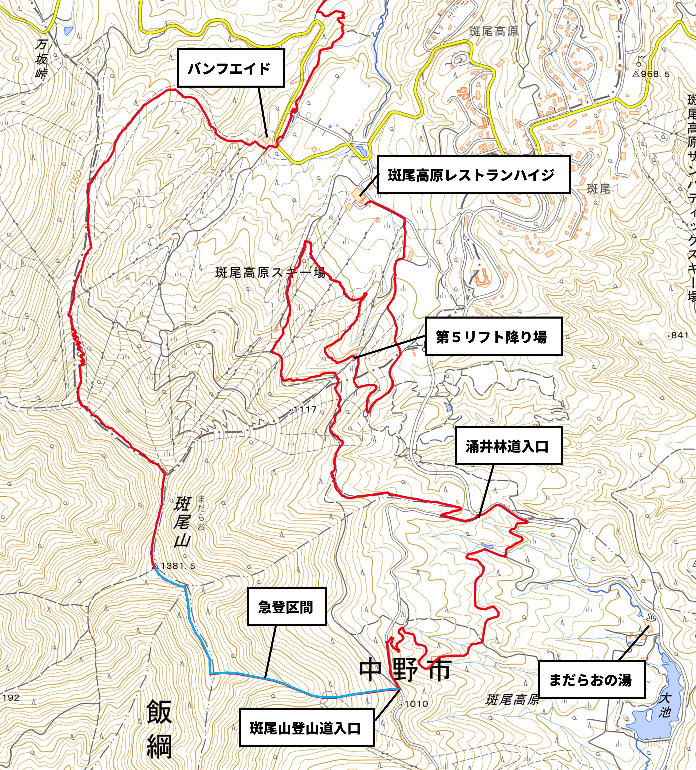●斑尾エリアで斑尾山山頂への登りを2024年の荒瀬原登山口(スタートから14.2㎞)からまだらおの湯上部の斑尾山登山道入口(スタートから6.9㎞)に変更いたします。