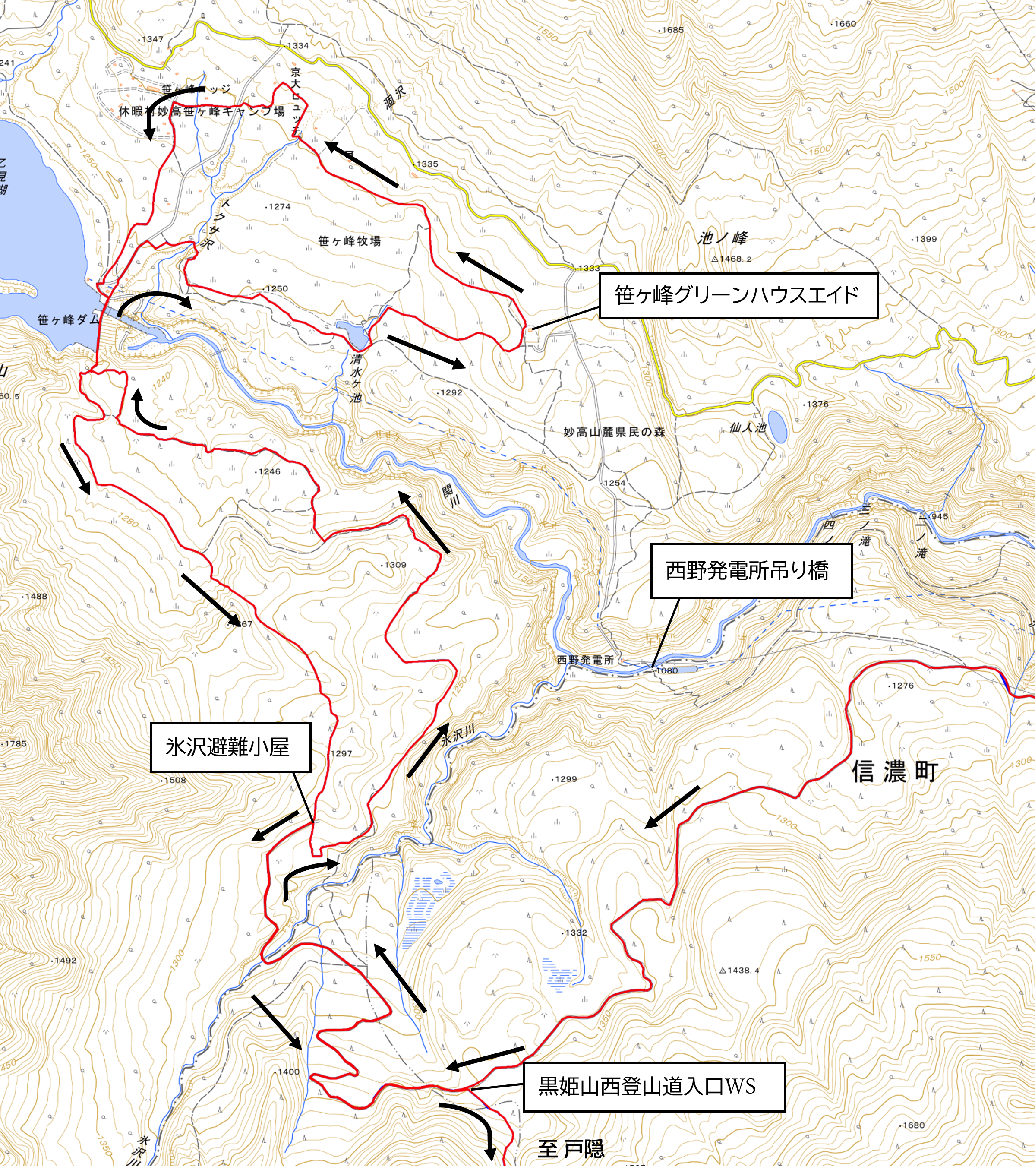 ※乙見湖堰堤上と氷沢避難小屋⇆黒姫山西登山道入口(WS)間だけは往路と復路のコースが重なりますが共に十分なコース幅があります。