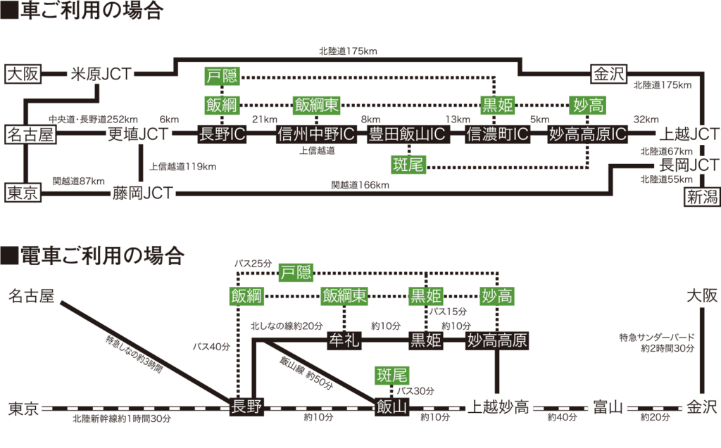 上信越自動車道「豊田飯山IC」または「妙高高原IC」が最寄りとなります。