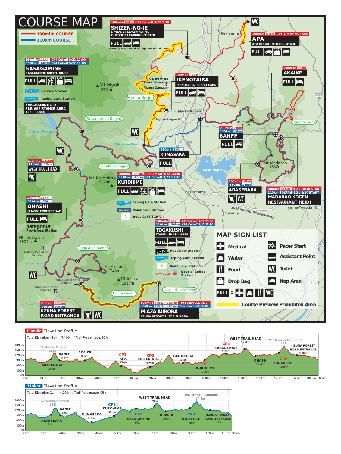 100mile: 7 locations (excluding Akaike and Ohashi Forest Road), 110km: 4 locations (excluding Kumasaka and Ohashi Forest Road)