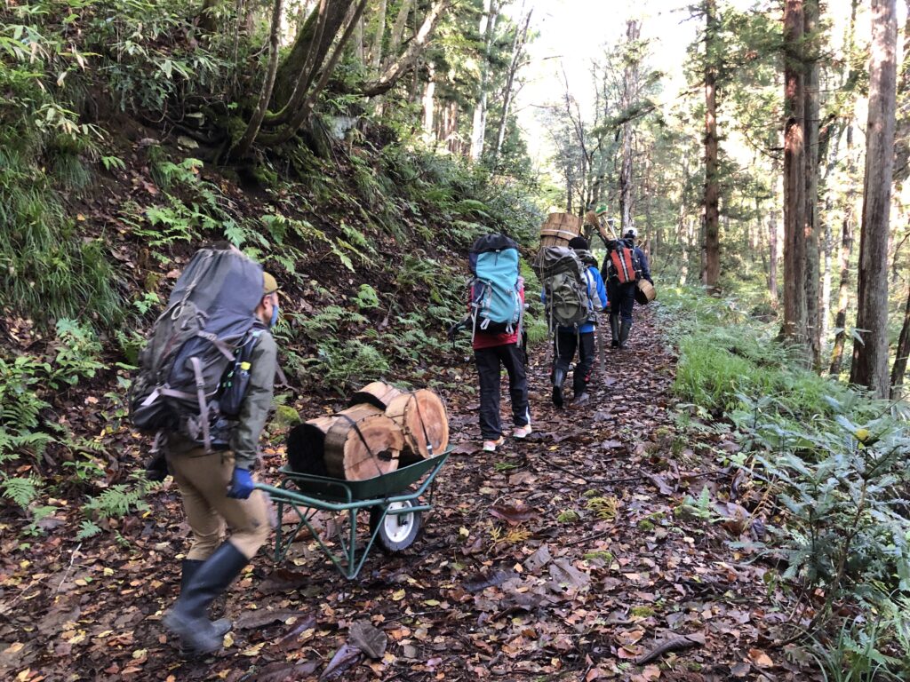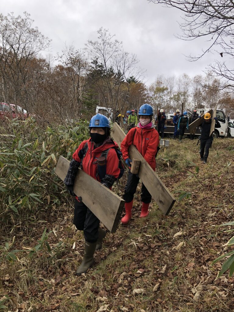 木道の材料である枕木や天板などは車で運べるところまで運び、あとは人力で現場まで運びます。枕木は約20㎏!ザックに詰めて背負っていきます。