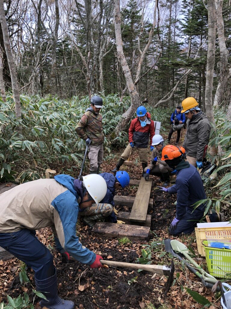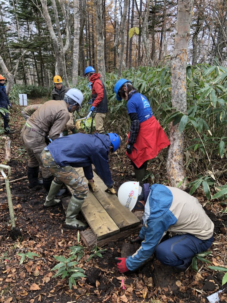 今回は、そのぬかるみがひどい箇所に木道を設置する作業を行いました。