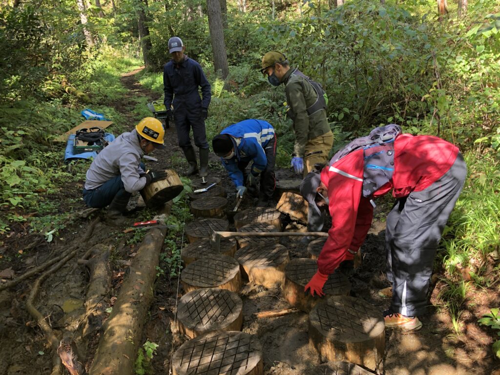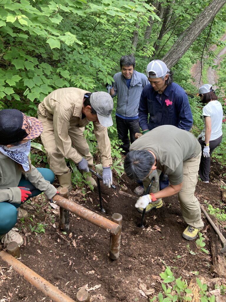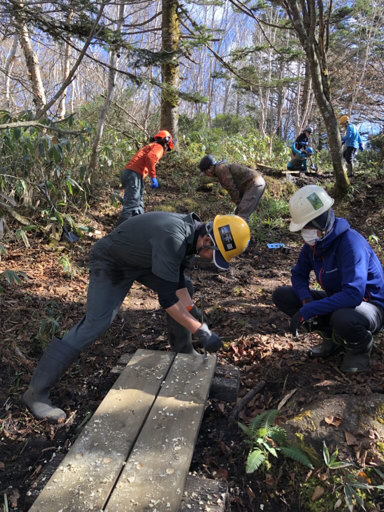 鉄杭を引き抜き、新しく木製の土留めを打ち込む作業を繰り返し、斑尾山頂へ続く新たな階段が出来上がりました。