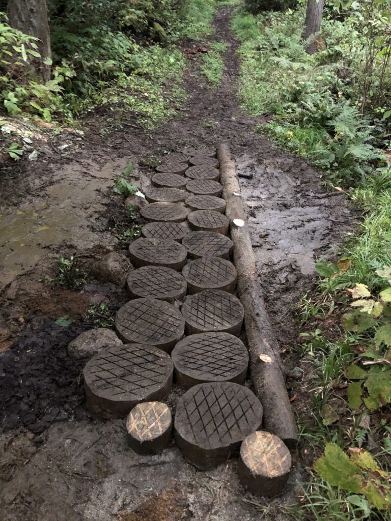 木材の上を通行することでトレイルが広がること、ぬかるみ箇所の広がりを抑止します。