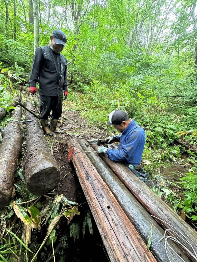 今年、新たなコースへと変更を行うにあたり、長年にわたり風雨にさらされ老朽化していた木橋の掛け直しを行いました。トレイルを利用する皆さんにとって、安全で快適な道を提供するための重要な作業です。新しい木橋は、ここを通る方々が安全に渡れるよう慎重に設置しました。